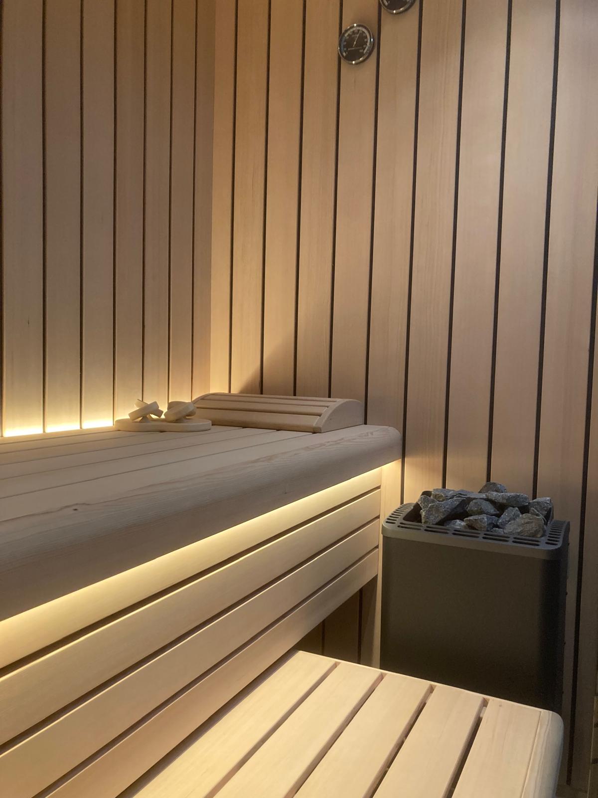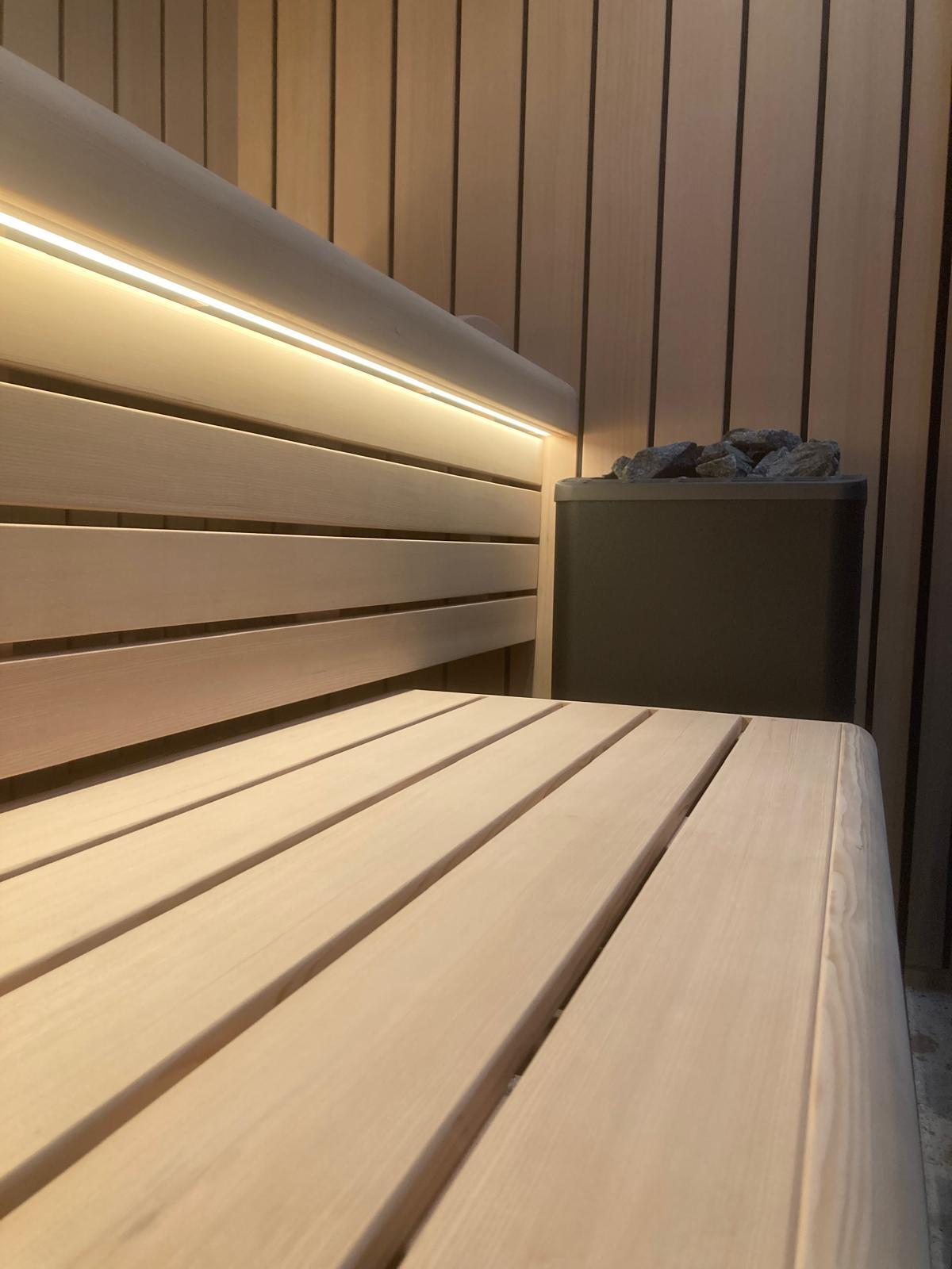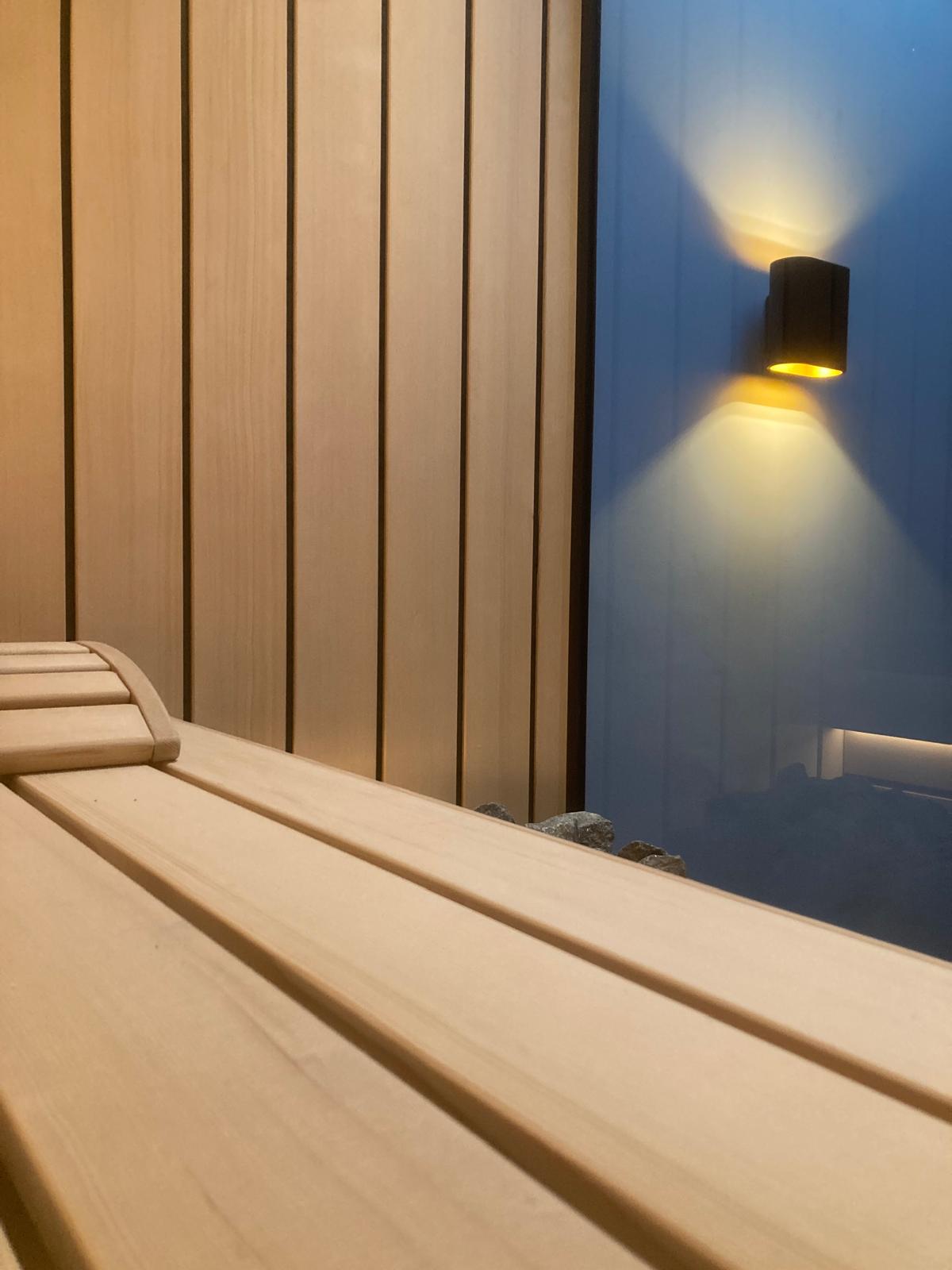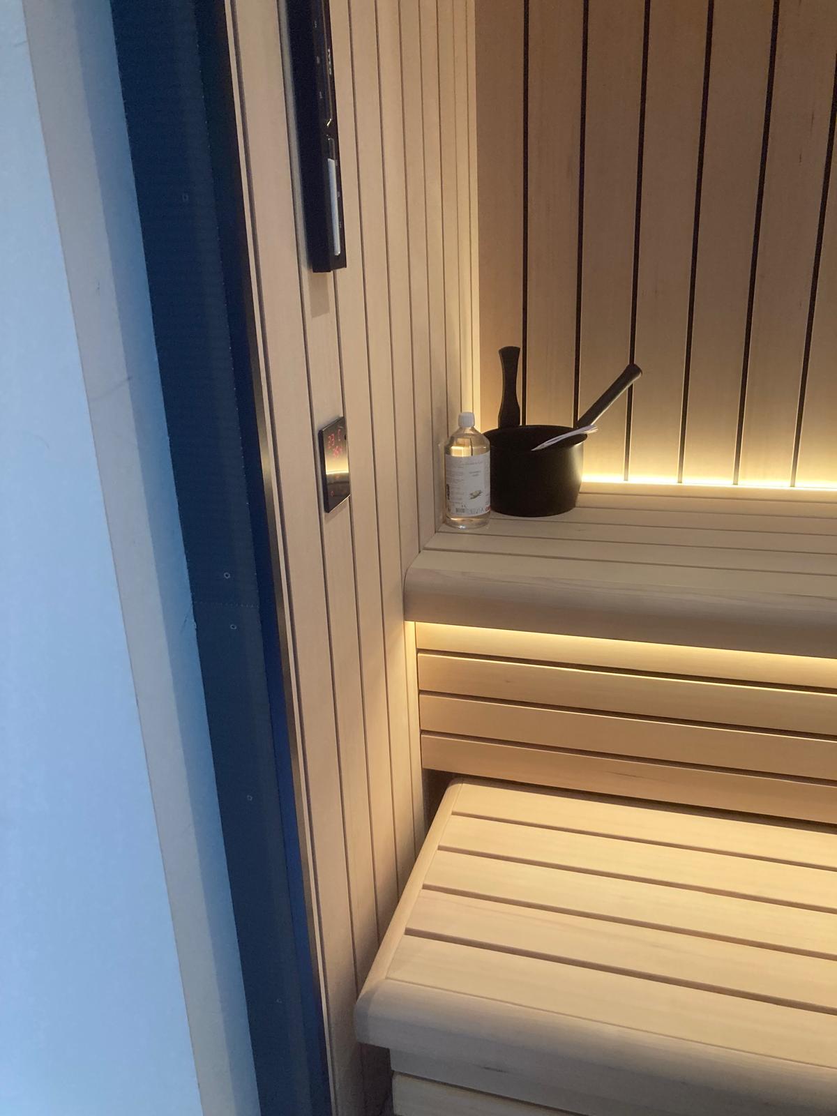 Verder heeft de sauna een Thermo-Tec standkachel 6,0kW, die wordt aangestuurd door een Xenio 110 bedieningspaneel.