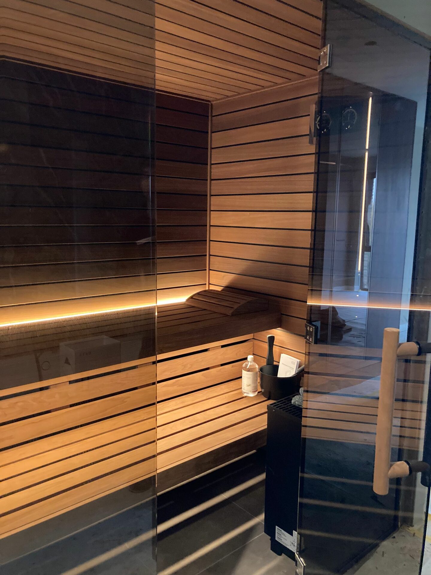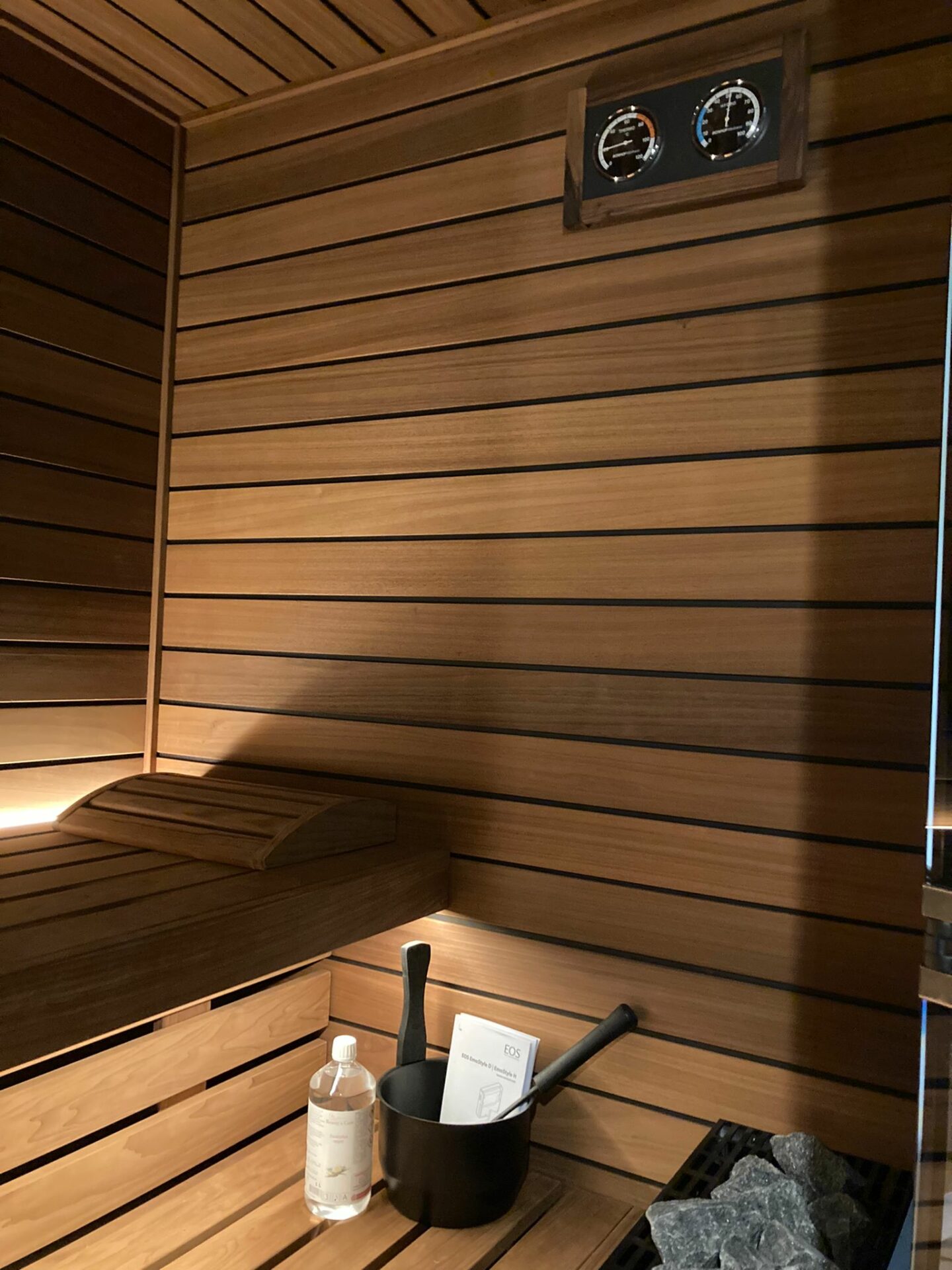 Verder heeft de sauna een Gracil Black 6,0 kW kachel met afgewerkte achterzijde, die wordt aangestuurd door een EmoSytyle D bedieningspaneel.
