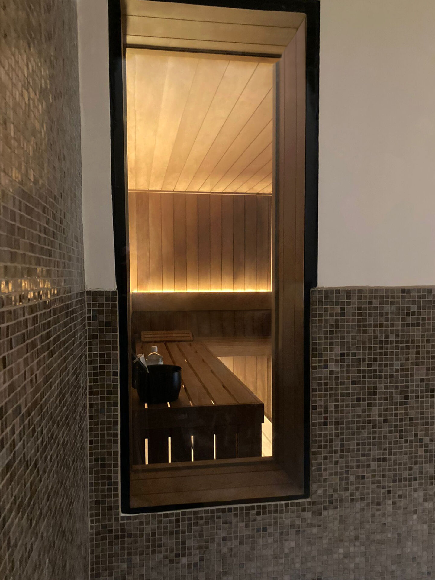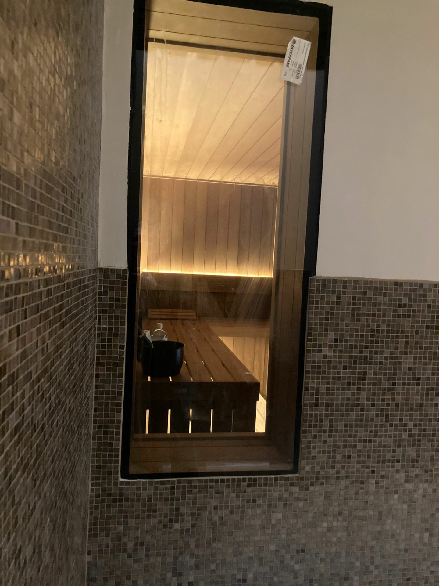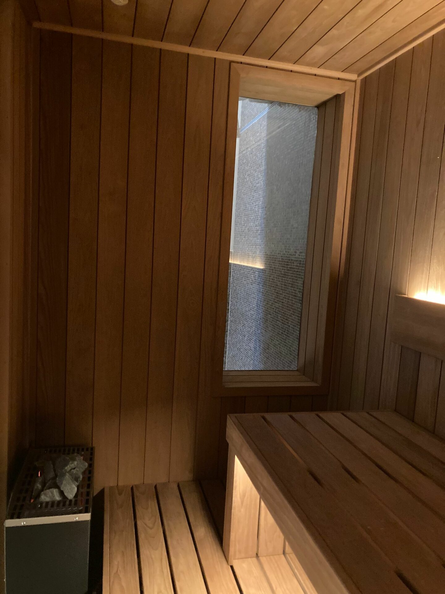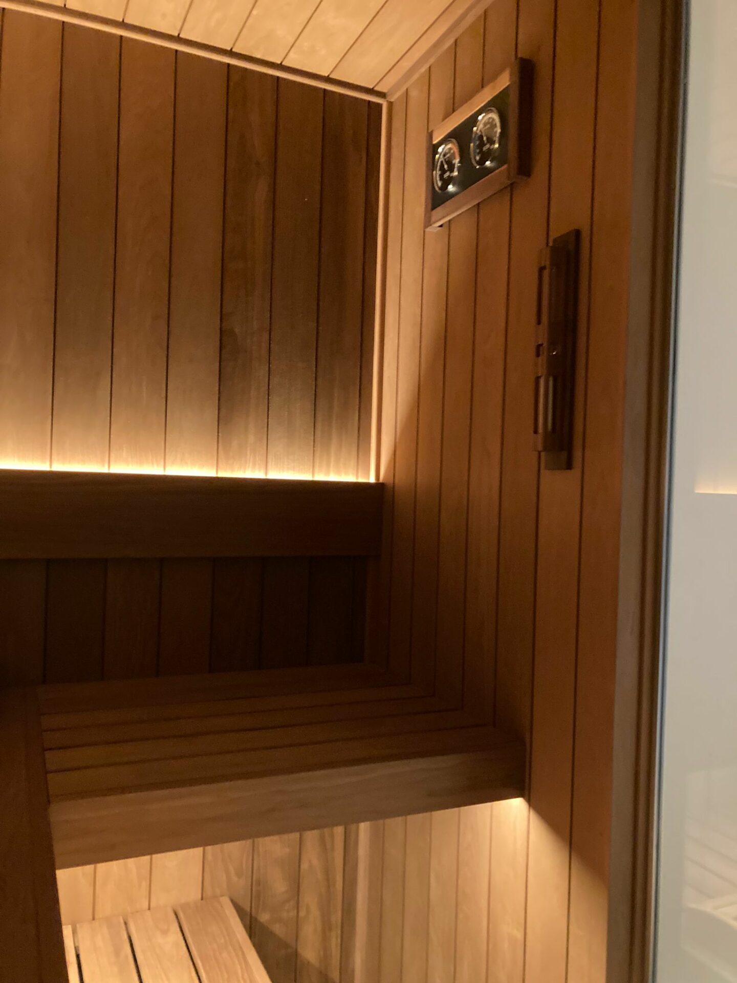 De sauna heeft een Gracil 9,0kW kachel, die wordt aangestuurd door een EmoTec D bedieningspaneel.