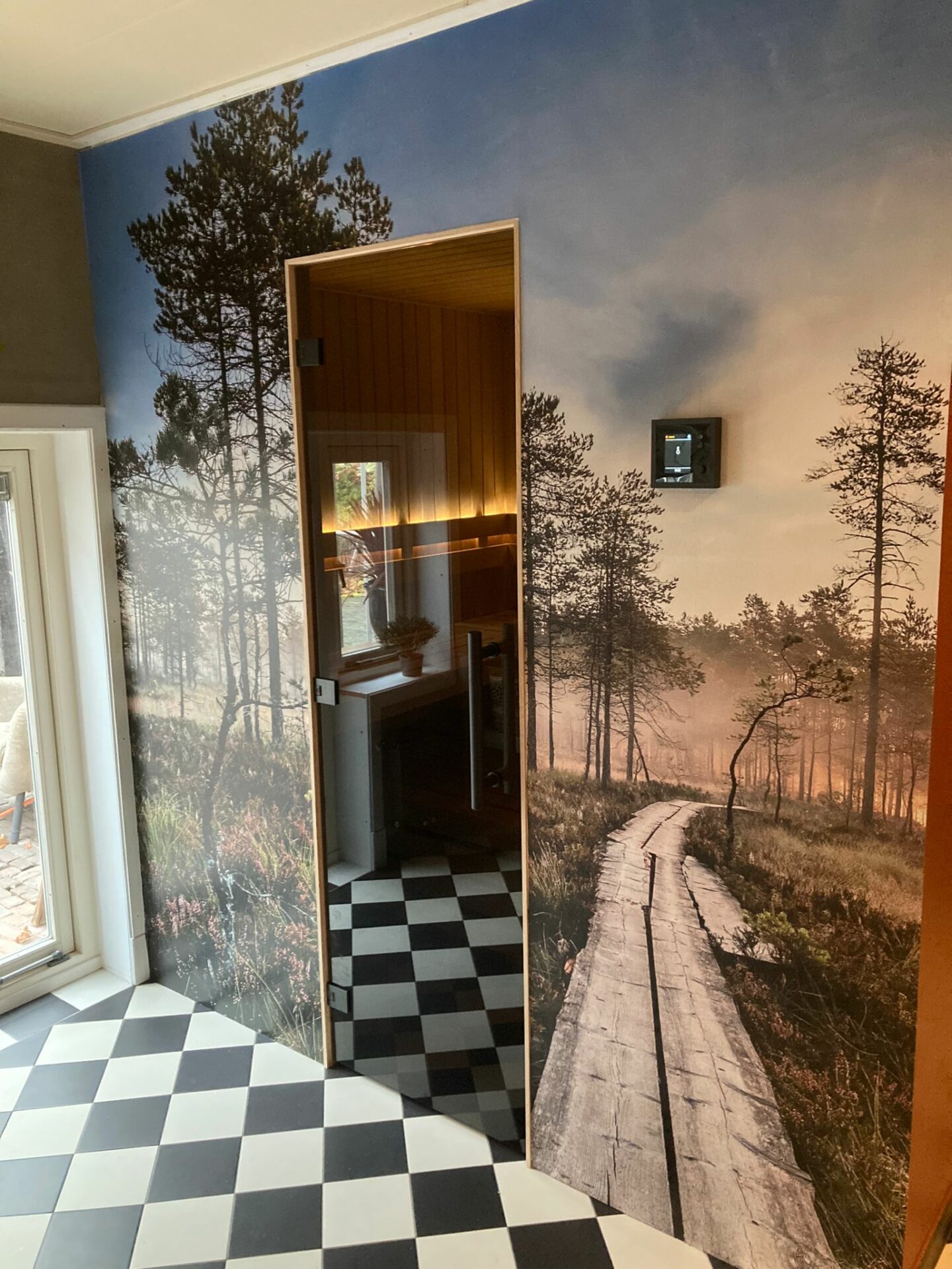 In Zelhem is een sauna (ca.230x200x222cm. buitenwerks) van hemlock hout gebouwd. De buitenkant is dicht gezet met stucbare Hydro ak platen, waar overheen is behangen.