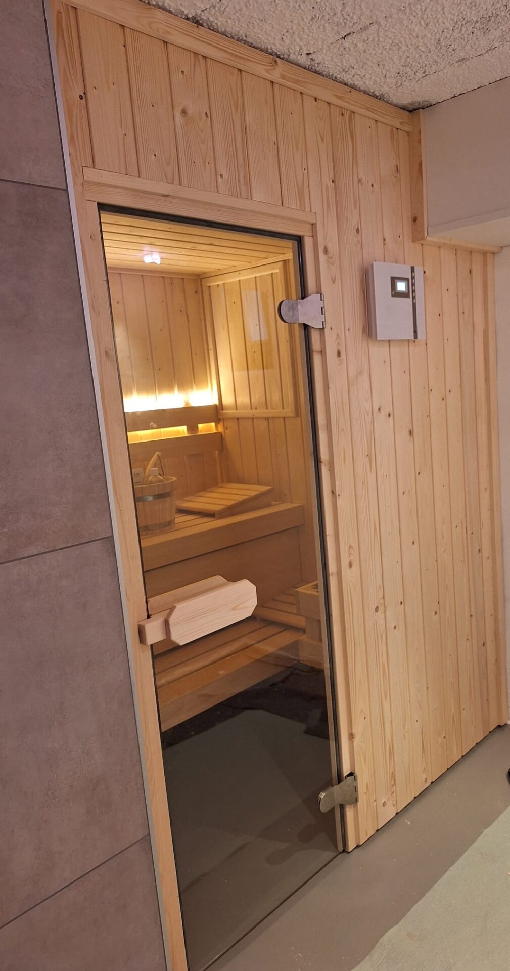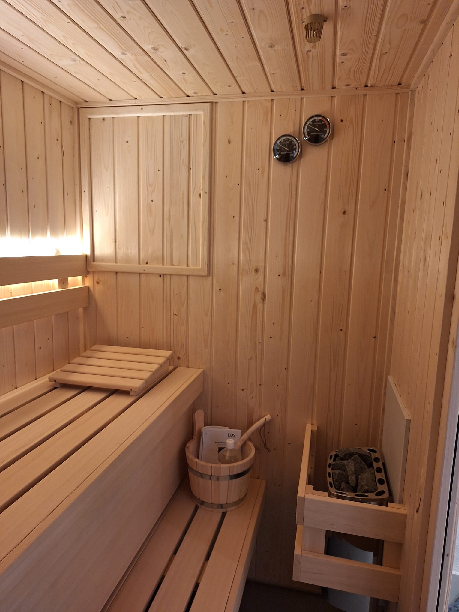 De sauna heeft een Sawo 3,6kW kachel, die wordt aangestuurd door een Econ D1 bedieningspaneel, die aan de buitenzijde van de sauna is gemonteerd.